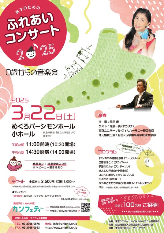 0歳からの音楽会「親子のためのふれあいコンサート2025」めぐろパーシモンホールで開催決定 ゲストにオカリナ奏者 佐藤一美