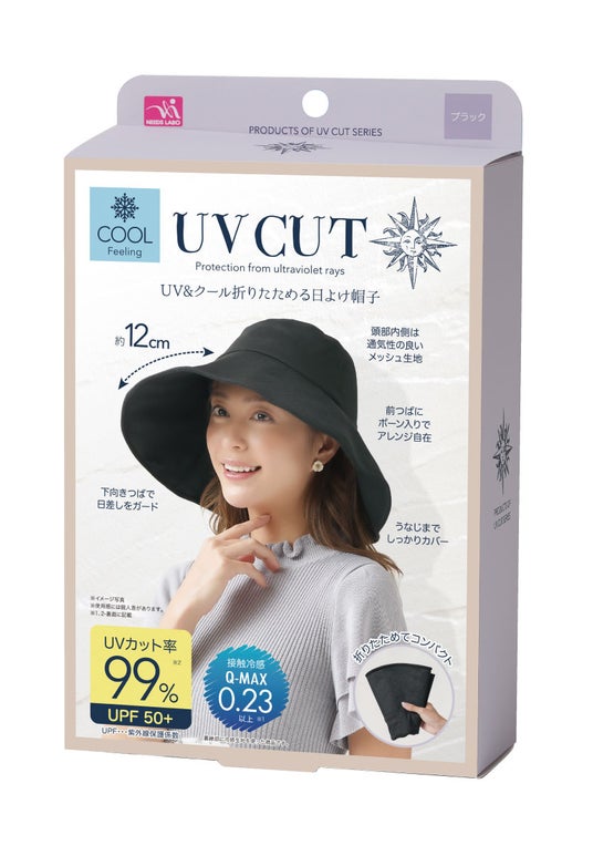 安心のUVカット率で普段使いしやすい「UV&クール折りたためる日よけ帽子」は丸顔、面長問わず誰でも似合うつば広タイプ。