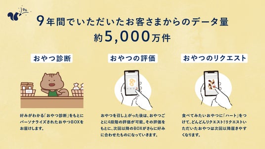 今年でお客様からいただいたデータの総量(おやつ診断の総数・リクエストのおやつの総数・おやつの評価の総数)は合計で5,000万を超えました。