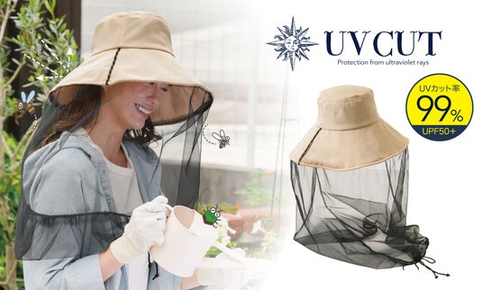UVカット率99%!広いつばに付いたネットが顔まわりを360°虫からガードする!