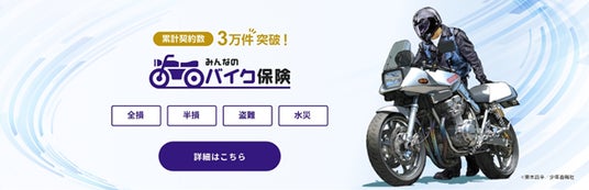 当社が提供する「みんなのバイク保険」は、交通事故による車両の全損・半損や、盗難、水災から大切なバイクをお守りする車両専用保険です。おかげさまで販売開始から今年で9周年を迎え、万が一の際にも購入時からの経過年数にかかわらず購入金額を基準に補償することで、多くのバイクユーザーの皆様からご好評をいただいております。