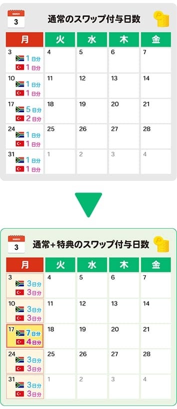 3月限定の本キャンペーンは、トルコリラ/円 LIGHT、南アフリカランド/円 LIGHTの新規買いポジションを毎週月曜日に持ち越すと、通常のスワップに加えて+2日分のスワップを獲得できます。そのため、月曜日にポジションを持ち越すことで、よりお得にスワップを受け取ることが可能です。