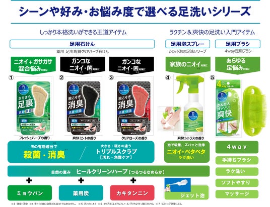 2010年の発売以来、洗うだけで足の角質ケア・消臭・殺菌ができる足用石けんとして支持され、シリーズ累計出荷数は1200万個(*2)を突破。2025年3月に「自由は足から始まる。」をスローガンに、全5SKUをブランド刷新。足の健康と自由をサポートしています。