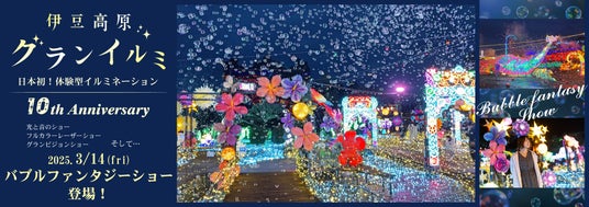 伊豆ぐらんぱる公園の伊豆高原グランイルミでは、シャボン玉が乱舞する新たなショー「バブルファンタジーショー」が2025年3月14日(金)より登場いたします。