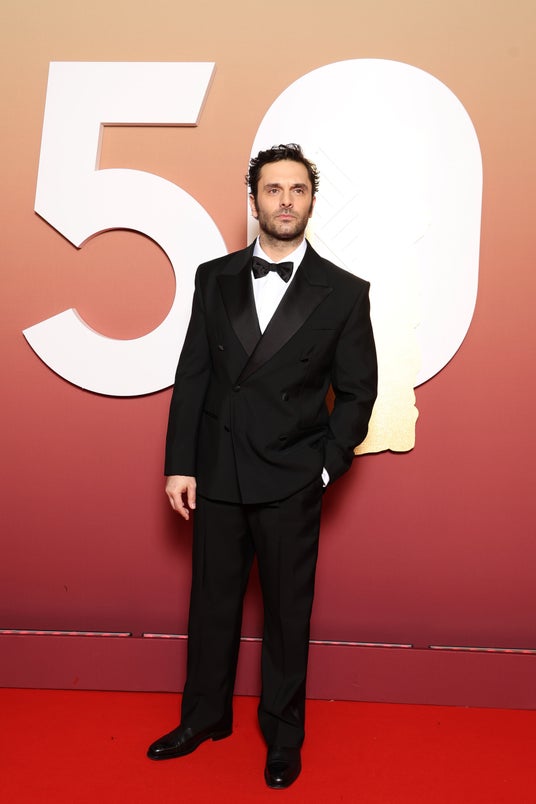 タハール・ラヒムは、ネイビーのブレストスーツにフレアパンツ、ネイビーのモックネックセーターにネイビーのローファーと合わせました。