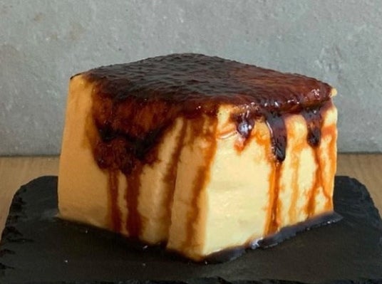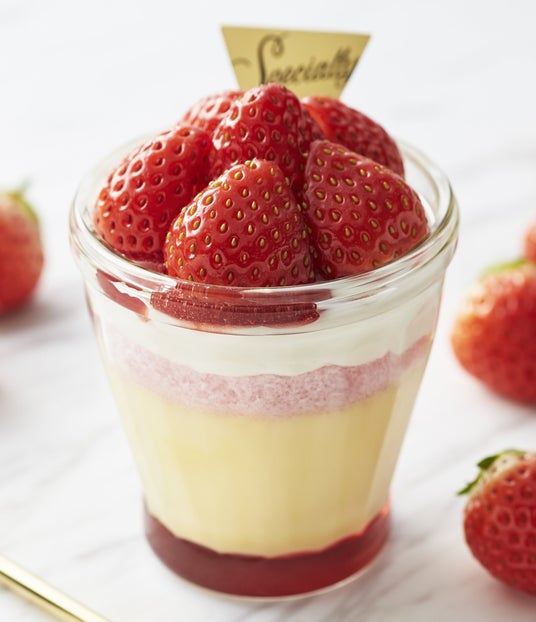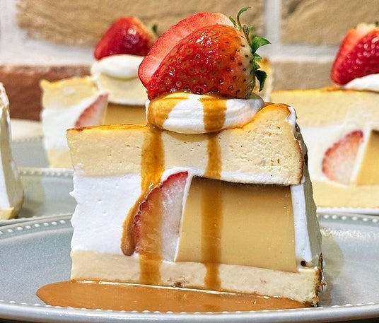 濃厚なバスクチーズケーキでいちごの果実とプリンをサンドしました。