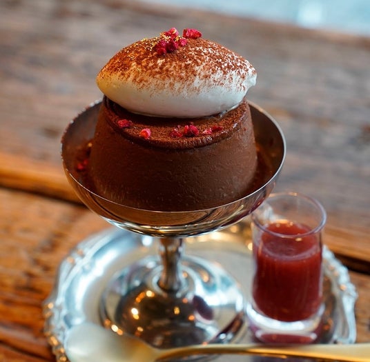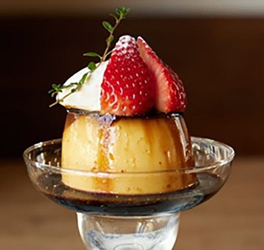 名古屋コーチンの卵を使った濃厚なプリンを主役に、ビターなキャラメルソース、バナナとオーガニックカカオのタルタル、いちごのマリネ、アマレットのムースを合わせた大人のプリンアラモード。