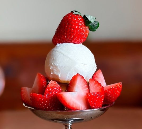 卵のコクを感じるプリンに、ミルクアイスと新鮮な国産いちごをトッピング。