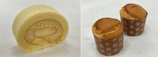 「米粉と大豆粉のケーキミックス」を配合して作ったプラントベース仕様のロールケーキ(左)とマフィン(右)