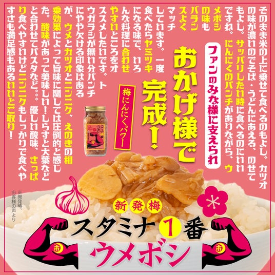 辛みを抑えたことで、にんにく好き・梅干し好きはもちろん、「スタミナ1番はちょっと辛すぎた…」という方や、女性・高齢の方にも手に取っていただきやすい新感覚のご飯のお供が誕生しました。