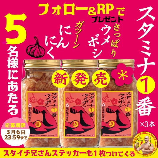 スタミナ1番ウメボシの新発売を記念し、X公式アカウント(スタミナ1番 NoガーリックNoライフ【公式】)にてフォロー&リポストキャンペーンを開催いたします。抽選で5名の方に「スタミナ1番ウメボシ280g」を3本と「スタイチ兄さんシール」をプレゼント。詳細は、公式Xにてご確認ください。