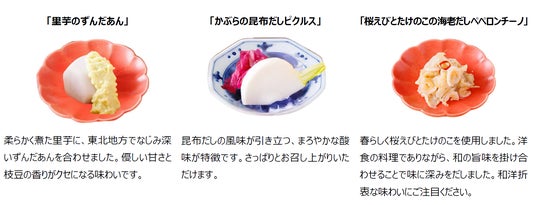 おかず豆皿6種は、すべて「おだし」を使用しており、深みのある味わいを実現しました。また、春のガーデンを思わせるような華やかな彩りにこだわりました。