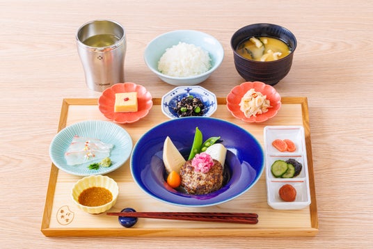 香ばしくジューシーなハンバーグ。かつおと昆布のだしスープに肉汁を溶け込ませることで、最後までおいしく味わうことができます。