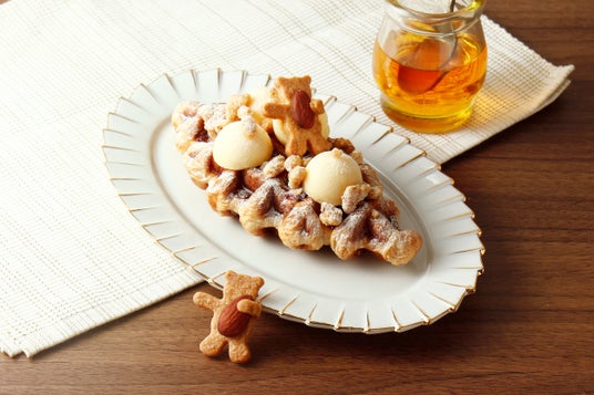 クロッフル生地にフランボワーズソース、アーモンド、湯煎焼したチーズケーキの上にはちみつ。 クランブルをトッピングし、クマさんのクッキー飾っています。