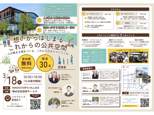 株式会社技研サービス(本社:岐阜県岐阜市薮田南3丁目7番20号、代表取締役社長:棚橋泰之)は、岐阜のまちづくりをテーマにしたイベント「想いからはじまる これからの公共空間」を2025年3月18日(火)にコワーキングスペースINNOVATOR'S VILLAGEにて開催いたします。