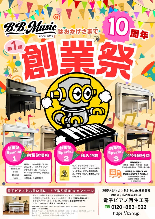 B.B.Musicは10周年を記念して創業祭を開催いたします。第1弾として、中古電子ピアノ本体の購入で送料無料エリアを拡大いたします。