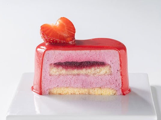 カシスベリームース、スポンジ、カシスベリージュレを重ね、赤いグラサージュルージュをかけて、ハート型にした苺をトッピングしました。