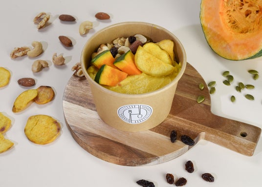 パンプキンボウルかぼちゃ豆腐クリームをベースに、シナモン・ナッツ・グラノーラ・レーズン・サツマイモチップス・バナナが絶妙にマッチ!秋冬だけじゃなく、1年中食べたい優しい甘さです。