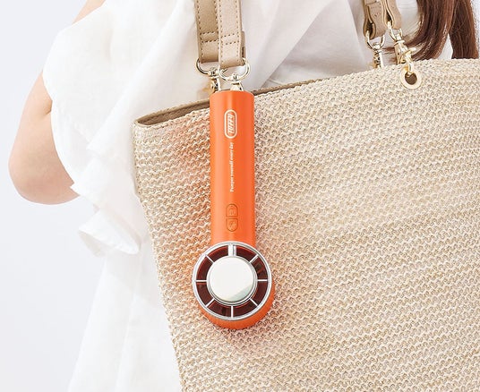 冷却プレート付きのハンディファン。ハンディ、首掛け、卓上で使える3Way!金属製のカラビナ付きで、持ち運びに便利。
