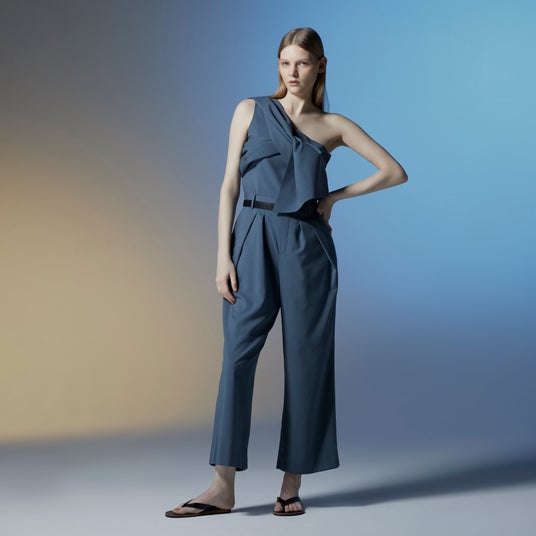 胸元に布を大胆に巻きつけたようなリボンモチーフが目をひく、アシンメトリーなワンショルダーオールインワン。胸元を飾る存在感のあるデザインがドラマティックな表情を生み出します。同素材のトップスとパンツを合わせて着ているようなデザインで、肩から流れるようなドレープと、パンツの美しいタックデザインがスタイリッシュ。大人の女性らしい上品でヘルシーな肌見せを楽しめます。