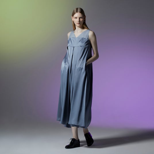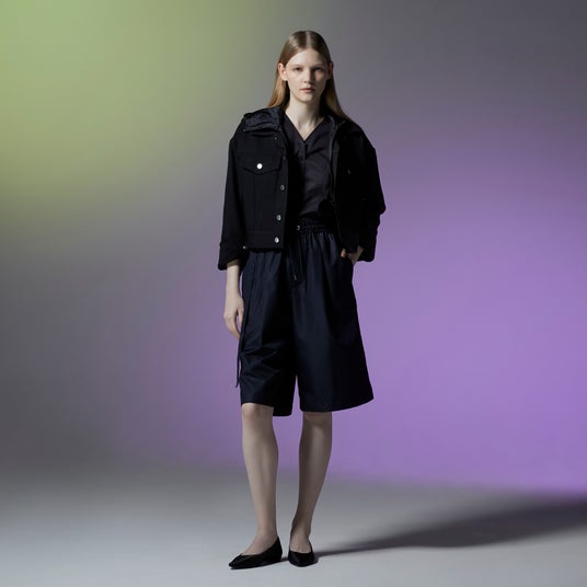 軽やかなツイル生地の素材感と、ドラマティックなシルエットが織りなす新感覚のラップスカート。エアータッチツイルジャケットと同じく、中空糸とストレッチ糸を複合させ独自に開発した素材を用い、カジュアルでありながら凛とした女性らしさを表現します。アシンメトリーに配置されたプリーツが、歩くたびに優雅な表情を見せる洗練されたデザインです。