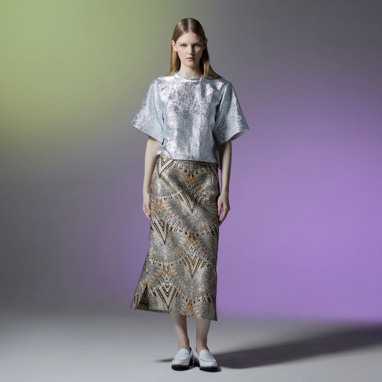メタリックな輝きを放つピーコック調の柄が存在感たっぷりなロングスカート。ジャカード織りで表現された、幾何学的なVデザインと羽のような曲線的なモチーフが織りなす、モダンでオリエンタルな雰囲気が魅力です。ラグジュアリーな見た目ながら、驚くほど軽やかな着心地を実現しています。