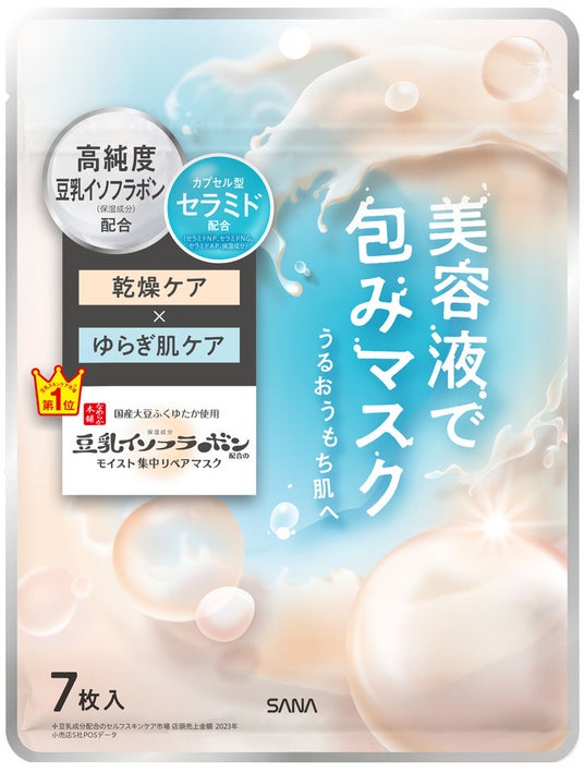 「モイストエッセンスマスク NC」は、ゆらぎがちなお肌を整えてうるおい肌へ導く7枚入りのマスクです。高純度豆乳イソフラボン※2とふくゆたか使用の豆乳発酵液※2、大豆由来の美容成分※4でカプセル化した3種のセラミド※5を贅沢配合した、まるで豆乳のような美容液で包みます。乾燥を防ぎ「守り」のケアを実現。うるおいキープ成分(グリセリルグルコシド、パンテノール、エクトイン/保湿成分)、整肌成分(グリチルリチン酸2K、アラントイン)配合で、うるおいを保ち、なめらかな素肌に。お肌を包み込む、ぴたっと密着シートを採用。美容液をたくわえて浸透※6させる高密着の3層構造シートとたっぷり150gの美容液で、お肌をうるおいで満たします。