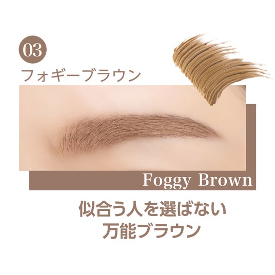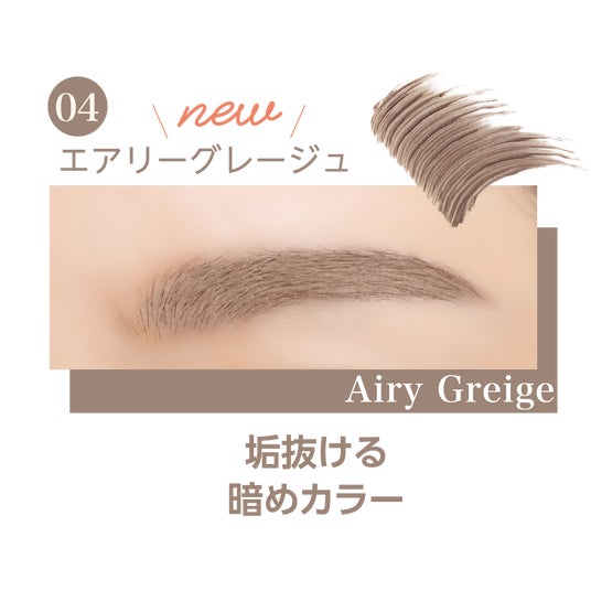 機能面、色味(01、04の2色のみ)をさらにパワーアップしてリニューアル登場です。眉の黒さを抑える白みベースにくすみパール配合で、ひと塗りで抜け感のある“高発色”に。くすみカラーが肌になじみ、ふんわり垢抜け眉をキープします。色味は01クリーミーベージュと04エアリーグレージュが、今っぽく使いやすいお洒落カラーにリニューアル。髪色やメイクを選ばず使いやすい全4色のくすみカラーで、眉メイクを楽しめます。