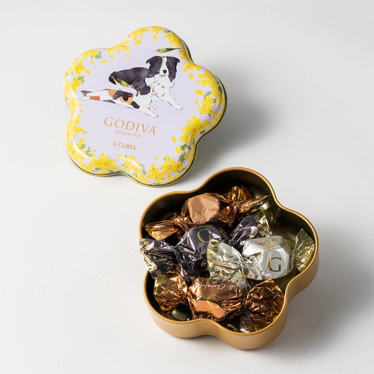 「羽ばたく春 G キューブ アソートメント フラワー缶 7粒入」うららかな春の陽気に包まれてくつろぐ動物たちを描いたお花形の缶に、3種類のG キューブを詰め合わせました。