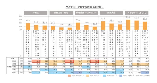 ダイエットに対する意識の中で、20代はメンタル・ストレス以外のほとんどの項目が全体と比べ5pt以上高い結果となりました。