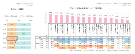 一方で、40代は全体と比べて5pt以上高い項目が少ないことから、40代で興味を持った後、実際にダイエットを開始して継続している50代は、よりストイックに実行する傾向があると推測されます。年齢的要因からも、ダイエットという視点だけではなく、日常的な健康管理の側面からも、食生活を意識しているのではないでしょうか。