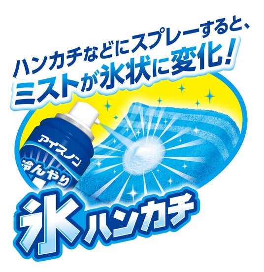 『アイスノン 冷んやり氷スプレー』は、お手持ちのハンカチなどに約1秒間スプレーすると、ミストが瞬時に冷たい氷に変化する瞬間冷却スプレーです。できた氷をほてった肌にあてればすぐにクールダウンできます。2003年の発売※1以降、どこでもサッと使える手軽さで好評をいただいています。今回、従来品※2の携帯性も考慮しつつ商品サイズを再検討し、使用回数を従来品よりも多い約70回※2とたっぷりご使用いただける商品になりました。また、パッケージ正面には氷の文字を大きく入れ、氷で冷やすスプレーであることを消費者に店頭で伝わりやすくしています。夏のおでかけ時や通勤・通学時、レジャーやスポーツなど、いつでもどこでも手軽に冷涼感を得られるお役立ちアイテムです。