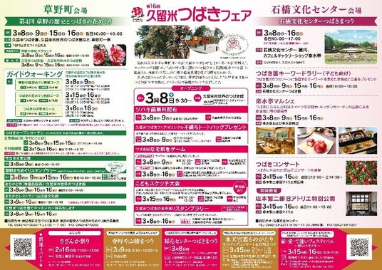 久留米つばき園では、大人向け・子ども向けのなぞ解きゲームやこどもスケッチ大会などを実施します。こどもスケッチ大会の作品はJR久留米駅の東西自由通路に展示します。草野町会場では、草野町を巡るガイドウォーキングや特産品販売を販売するまちかど市などを実施します。石橋文化センターでは、つばきにちなんだスイーツや飲食雑貨等を販売する楽水亭マルシェやつばきに囲まれた広場でコンサートなどを実施します。