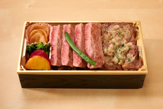 鹿児島県産「小田牛」の豪華3種盛り!きめが細かく柔らかなサーロインをステーキで。濃厚な甘味と旨味が感じられるリブロースを厚切り焼肉で。高級部位のロース肉の焼肉も楽しめる贅沢なお弁当です!