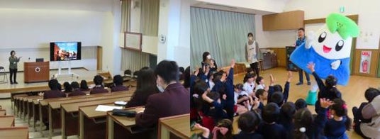 ▲富士山をモチーフにしたキャラクターの「カルチャくん」と一緒に地域の学校や保育園などで出張学習会を行います。