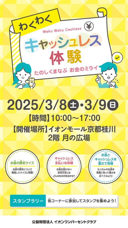 公益財団法人イオンワンパーセントクラブは、子どもたちにキャッシュレスの利点について肌で学んでいただくことを目的に、イオンフィナンシャルサービス株式会社ご協力のもと、金融教育イベント「わくわくキャッシュレス体験~たのしくまなぶ お金のミライ~」を開催いたします。