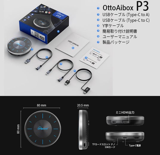 Otto Aibox P3は自動車用のスマートガジェットです。 Android 12のOSを搭載、ケーブルで車のUSB端子に接続すると、あなたの車でスマホと同じようにナビ案内、通話や映画、音楽鑑賞などができるようになります。