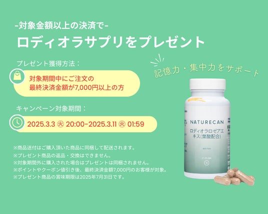 - 対象金額以上の決済でロディオラサプリメントをプレゼント!