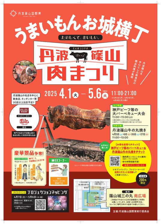 丹波篠山国際博実行委員会は、特産品振興イベントとして2025年4月1日~5月6日(一部月曜日除く)まで、篠山城三の丸南広場で「うまいもんお城横丁」(以下本イベント)を期間限定にて開催します。