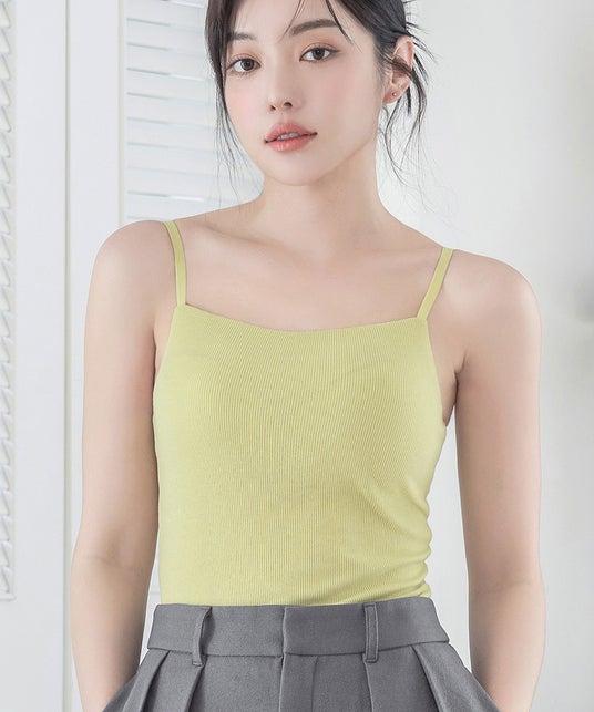 胸元が隠れる設計のブラキャミは、春のインナーにマスト。新色『ライムイエロー』で、いつものコーデにアクセントを。
