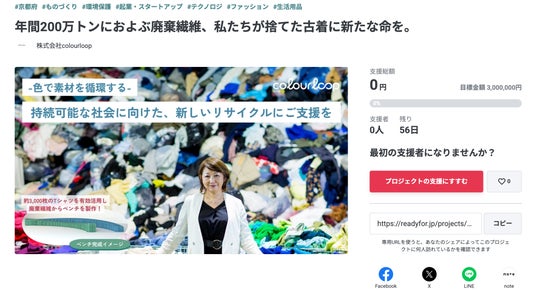 クラウドファンディングサービス「READYFOR」にて廃棄繊維を「色」で分けて再生する新たなアップサイクル技術を活用し、300万円を目標に、本日2025年3月5日から4月30日まで支援を募ります。