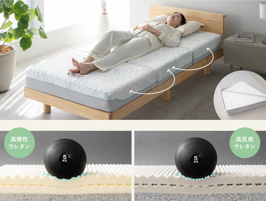 頭・脚部は高弾性ウレタン、腰部は高反発ウレタンを採用。沈み込み方が違う2種類のウレタンで、体圧をバランスよく分散します。また、下層部には支持性と通気性に優れた3D構造体を採用しました。