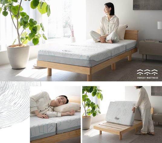 第一弾として、2025年3月4日より高機能三つ折りマットレス『エムール フォレストマットレス(以下フォレストマットレス)』の販売を開始しました。日本睡眠環境学会で寝心地に関する研究発表を行うエムール独自のトリプルリカバリー設計とハイブリッド構造で「科学的に寝心地が良い」を実現しました。