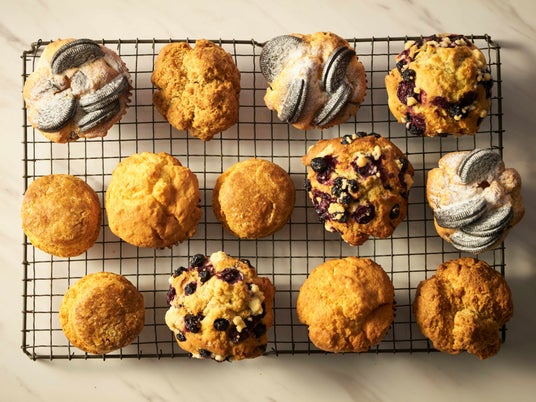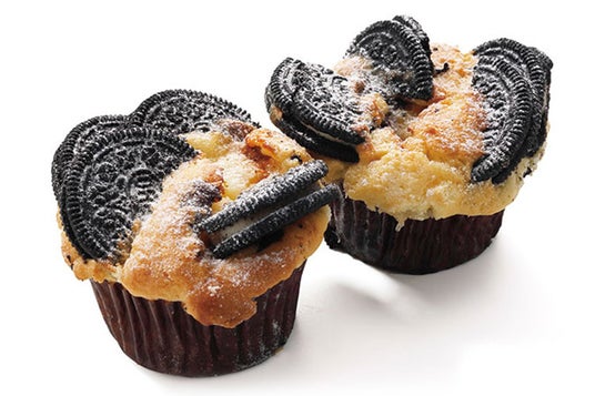 油脂をバター&低脂肪乳に変更し軽さをUPさせたマフィンと、舌触り&味わいがUPしました。チョコレートとマシュマロを忍ばせた生地に、クリームを挟んだビターなチョコレートクッキーを大胆にトッピング。仕上げに真っ白なパウダーシュガーを降らせました。ボリュームたっぷりの食べ応えのあるアメリカンマフィンです。