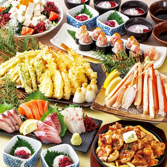歓送迎会プレミアム5,500円(税込)コース※2時間飲み放題付き豪華食材「茹で本ズワイガニ」や、「お刺身四種盛合せ」「天ぷら盛合せ」など和食の宴席で人気のメニューをラインナップ。2時間飲み放題が付いた全8品の充実したコースです。