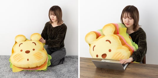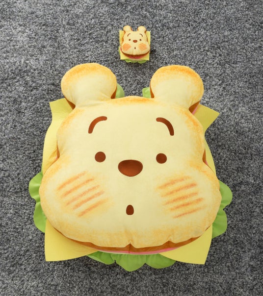 『ぬいぐるみS サンドウィッチ プー』同様、サンドウィッチならではのパンの焦げ目や側面の具材部分は様々な質感の生地を組み合わせることで再現され、その姿はまさに大きいサンドウィッチ。プーのきょとんとした表情と優しい色合いは室内のインテリアとしても馴染みやすいデザインとなっています。