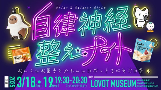 株式会社ギンビス(本社:東京都中央区、代表取締役社長:宮本周治)は、人が一生涯の健康・医療情報を自ら管理できるPHR(パーソナルヘルスレコード)システム「カルテコ」を開発・提供するメディカル・データ・ビジョン株式会社(本社:同千代田区、代表取締役社長:岩崎博之)と、ロボットベンチャーの GROOVE X 株式会社(本社:同中央区日本橋、代表取締役:林要)の共催で、「ご自愛の日(3月25日)」に合わせたイベント「自律神経整えナイト~おいしいお菓子とかわいいロボットで心をご自愛~」を2025年3月18 日(火)、19日(水)にLOVOT MUSEUMにて開催します。