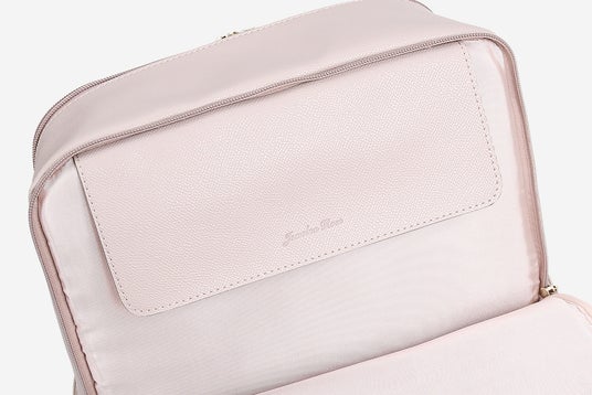 「リモハピ2 リュックサック」には、忙しい毎日に役立つ機能が充実しています。リュック上部のデッドスペースを活用できるポーチ、メイン収納部から独立したPC収納部、さらに小物の整理に便利なポケットを備えており、使い勝手は抜群です。また、ボディにお手入れしやすく傷が目立ちにくい上品な合皮素材を使用しているため、長く綺麗にお使いいただけます。