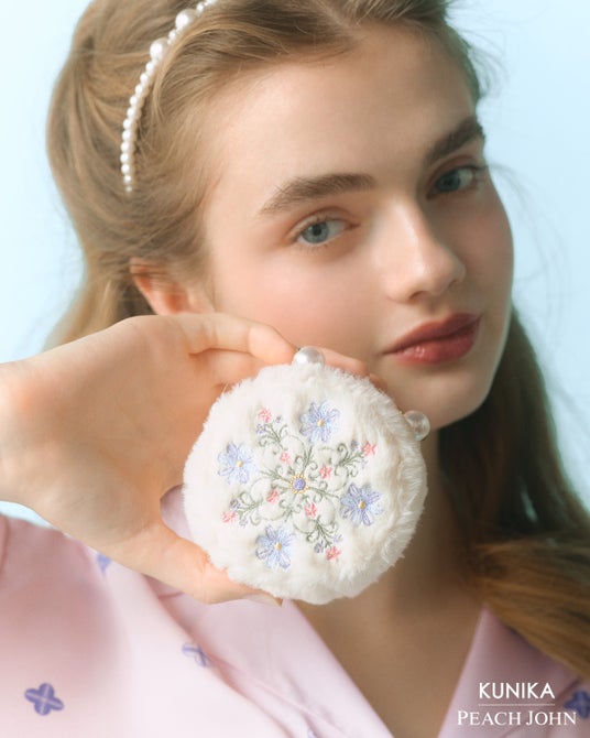 アイシングクッキーをイメージしてデザインしたアクセサリーポーチ。ふわふわと柔らかなエコファーを全体の表地に使用し、天面にはKUNIKA氏手書きデザインのフラワーモチーフを刺しゅうしました。ファスナーの引き手には大粒のフェイクパールをアクセントにプラス。