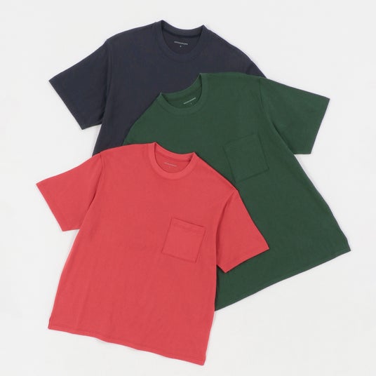 胸元のポケットがアクセントのシンプルな半袖Tシャツ。落ち着いた印象のネイビー・グリーンと、長野県の名産品である蕎麦の「赤そばの花」をイメージしたレッドの3色展開です。